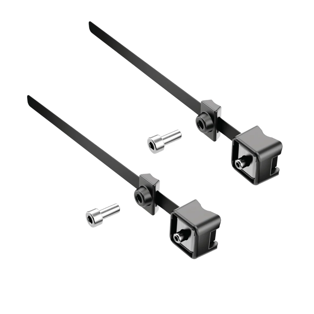 Ces deux colliers permettent de fixer un antivol de cadre sur un cadre non équipé des filetages nécessaires. Fixés de part et d’autre de l’antivol, sur chaque hauban, ils recréeront les deux filetages femelles recevant l’antivol de cadre.