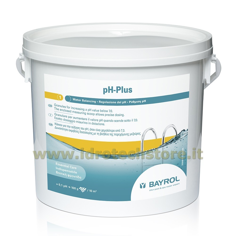 Utilizzo: per aumentare di 0.1 il PH utilizzare 1 Kg. di PH PLUS ogni 100 metri cubi di acqua. Per aumentare di 0.2 il PH utilizzare 2 Kg. di PH PLUS ogni 100 metri cubi di acqua.