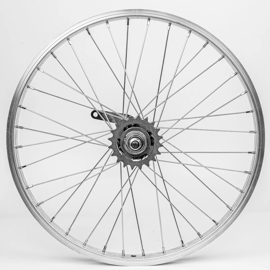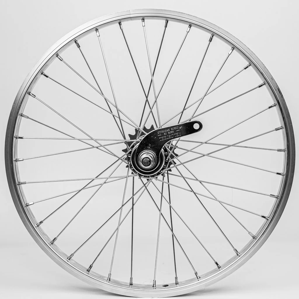 Cette roue montée est équipée d’une jante simple paroie en argent, montée avec 36 rayons. Son moyeu à rétropédalage est fourni avec le collier d’attache, un axe plein et un pignon de 20 dents. Il est aussi possible de vous procurer un autre pignon si nécessaire en 16, 18 ou 19 dents. Pour une rénovation complète, une roue avant 20 pouces x 21 vous est proposée en produit complémentaire. Dans une autre taille, est également disponible la roue arrière rétropédalage 26 pouces.